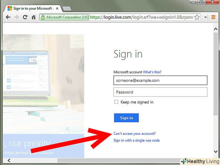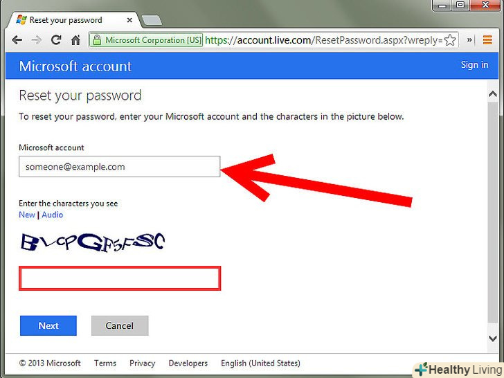 Перейдіть на головну сторінку Hotmail, якщо не вдається отримати доступ до свого аккаунта за допомогою секретних питань. натисніть посилання " Не вдається отримати доступ до свого облікового запису?»- Щоб скинути пароль, вкажіть свій обліковий запис Microsoft і введіть символи, зображені на зображенні внизу.