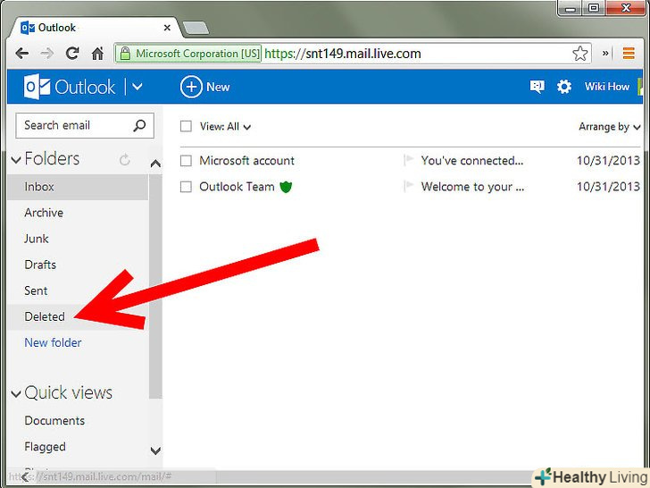Відновіть видалені повідомлення. коли Microsoft встановить злом вашого аккаунта, то вони перенаправлять ваші повідомлення в безпечне місце.- Натисніть вкладку "кошик" на панелі ліворуч і прокрутіть вниз сторінки.