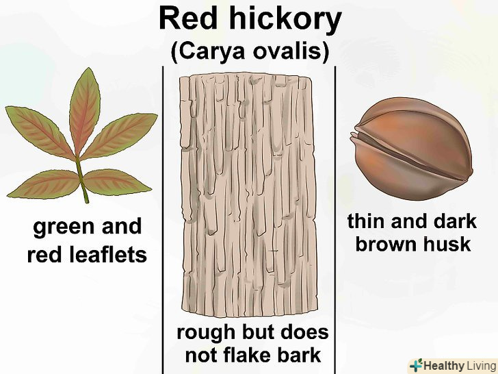 Розпізнаємо червоне гікорі (Карія овальна). Червоне гікорі росте на схилах лісових хребтів. Його листочки зелені і червоні, тонкі і клиноподібні, ростуть по 5 листків до живця. Краї листя червоного гікорі плавно зазубрені, на відміну від зазубрених листя великого каштана гікорі і південного яйцевиднолистного гікорі. Плоди червоного гікорі від 2 до 3 см в довжину і 2 см в ширину. Круглі, світло-коричневі з тонкою оболонкою, вони мають солодкий смак. Лушпиння тонке і темно-коричневе. Кора червоного гікорі груба з вузькими вертикально-смугастими борознами, не злазить і не відшаровується.