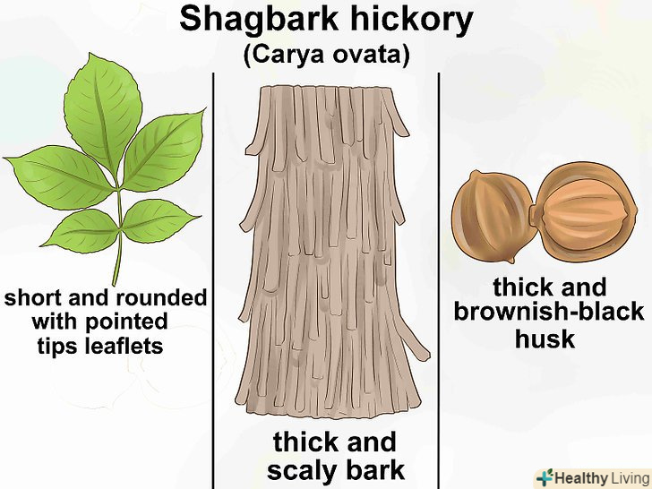 Подивіться на горіхи. горіхи гікорі мають деревну зовнішню оболонку або лушпиння. [2] спочатку лушпиння зелене, а потім змінюється на світло-коричневу зі швом посередині. Товщина лушпиння може варіюватися в залежності від виду, але горіх всередині буде білий або жовтувато-коричневий, маленький за розмірами. [3]