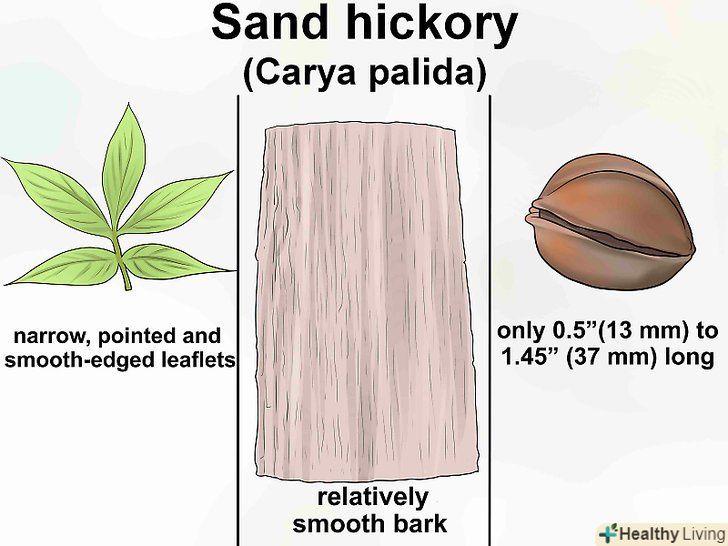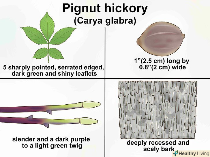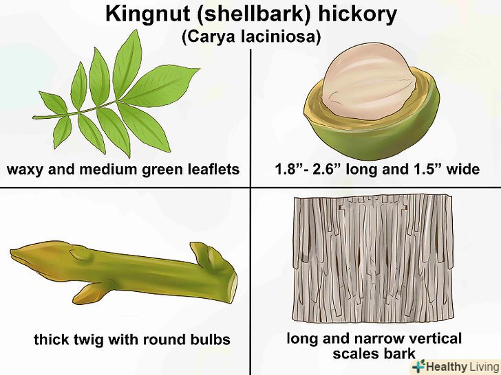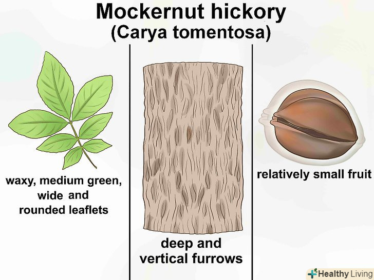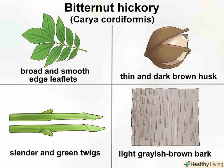 Розпізнаємо гірке гікорі (Карія серцеподібна). цей вид росте у вологому лісі, який також називають паровими балками. Широкі і гладкі по краях листя ростуть по 9 листків до живця. Плоди гіркого гікорі від 2 до 4 см в довжину закриті в тонкому темно-коричневому лушпинні. Ядро горіха гірке, звідси і назва. [7] гілки гіркого гікорі тонкі і зелені, мають відмінні жовті бутони. Кора гікорі світло-сірувато-коричнева, і не тріскається досить глибоко, щоб відшаровуватися.