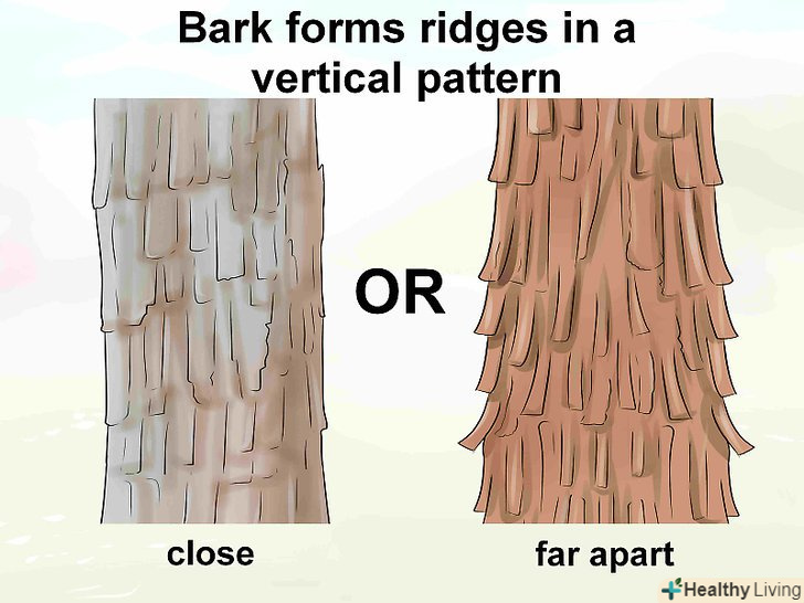 Подивіться на кору. Кора дерев гікорі утворює борозни у вертикальній структурі. Ці борозни можуть бути дрібними або глибокими, далеко один від одного або близько, але завжди вертикально. Крім того, кора деяких видів гікорі тріскається на краях пластин, коли дерево дозріває, в результаті чого кора відшаровується зверху донизу.