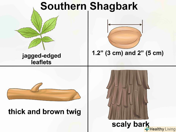 Розпізнаємо Південне яйцеподібнолисте гікорі (Карія Північно-Каролінська). Південне яйцеподібнолистне гікорі росте у вапнякових ґрунтах. [6] Листя дерева зубчасті з гострими краями, ростуть по 5 листків до живця. Гілки товсті і коричневі, кора відшаровується і наростає по краях, надаючи дереву кошлатий вигляд. Плоди Південного яйцеподібнолистого гікорі виростають від 3 до 5 см в довжину, мають овальну або круглу форму, покриті товстим шаром лушпиння. Нутрощі горіха солодкі.
