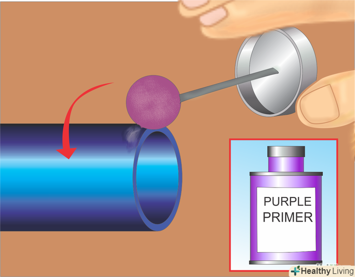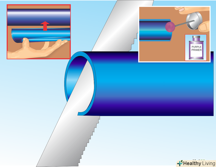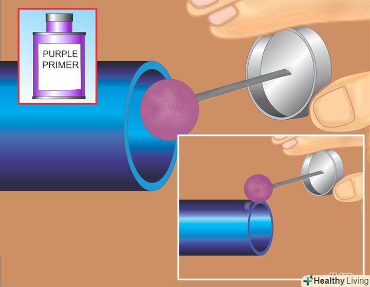 Обробіть кінці з'єднуються труб очищувачем по 3-5 см, починаючи від краю. таким же чином, обробіть кінці всередині двох з'єднувальних муфт. Одягніть муфти на труби, попередньо змастивши місця з'єднання зовні труби і всередині муфти клеєм. Дійте швидко, щільно надіньте муфту з повертаючим рухом на трубу до упору. Зафіксуйте трубу на 15-20 секунд в муфті. Швидкість дуже важлива, тому що деякі марки клею висихають за 10 секунд. Повторіть з другою трубою.