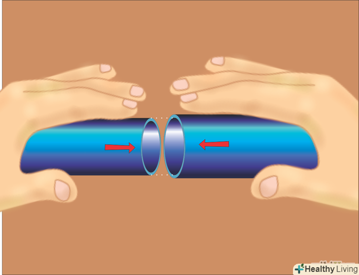 Обробіть обидва кінці ремонтної труби очищувачем, почекайте 5 секунд, потім нанесіть тонкий шар клею на один кінець зовні труби і всередині муфти. вкручуючи, щільно вставте трубу в муфту до упору. Не раніше, ніж через хвилину (клей повинен добре висохнути), повторіть те ж саме з іншого боку. Другий кінець вставляти складніше, можливо, вам доведеться вигнути трубу з муфтою вгору або в сторону, щоб з'єднати кінці. Не турбуйтеся, ПВХ міцний матеріал. До повного висихання має пройти 3-5 хвилин, перш ніж можна буде подавати воду.