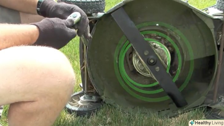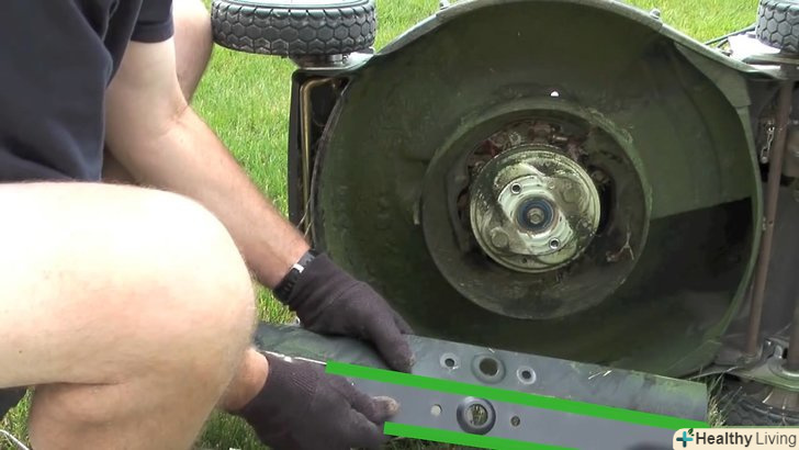 - Відмінна ідея одягнути товсті робочі рукавички для виконання цієї роботи, щоб уберегти руки від пошкоджень. Також доцільно використовувати шматок дерев'яного бруска, щоб розклнити ножі, коли ви їх прикручуєте. Ви можете вставити цей дерев'яний брусок між лезом ножа і декою косарки, щоб ножі не прокручувалися.