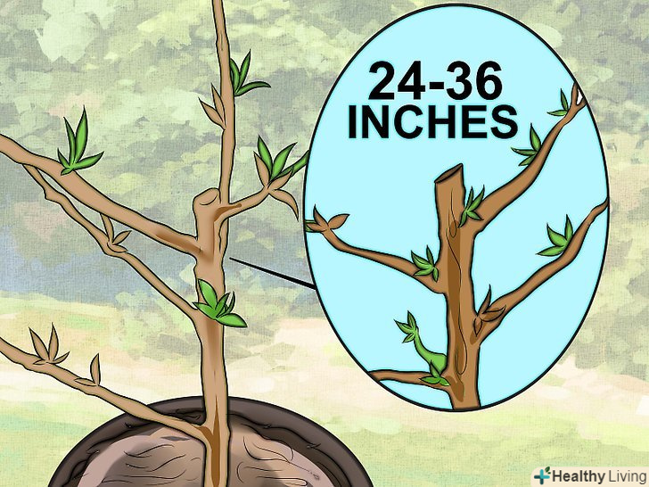 Почніть з верхівки. ви повинні зрізати 60-90 сантиметрів з верхівки дерева, що сприятиме подальшому зростанню додаткових гілок. Дуже важливо зробити це через рік або два після посадки дерева, щоб контролювати форму дерева в міру того, як воно буде рости. До обрізки верхівки дерева, зробіть його виміри, щоб переконатися, що воно досить виросло. Якщо молоде деревце мало високе, почекайте, поки воно не підросте ще на 75 сантиметрів, перш ніж робити обрізку. До обрізки, почекайте поки дерево не зміцніє досить для того, щоб процедура йому не нашкодила.- Робіть обрізку восени або взимку, коли дерево ще спить. Якщо ви прочекаєте до весни, на ньому вже встигнуть утворитися нирки. Якщо ви будете робити обрізку, коли на дереві вже сформуються нирки, енергія витрачена деревом на формування нирок пропаде даремно. Обрізка дерева до моменту формування на ньому нирок дозволить йому пустити невитрачену енергію на утворення нових здорових гілок.