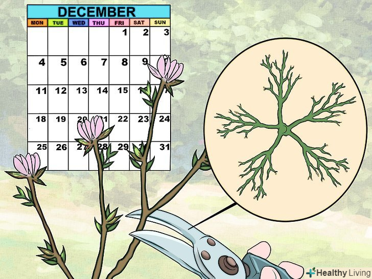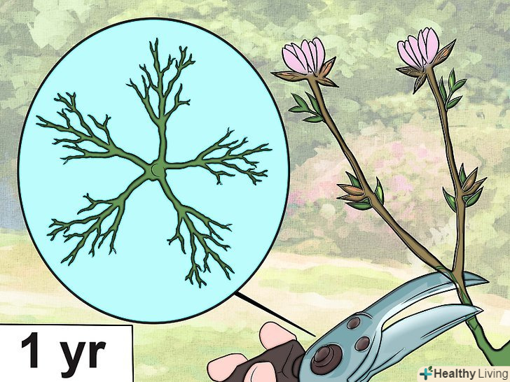 Через рік зробіть опорочне кільце. Опорочне кільце складається з 4 бічних гілок дерева. Вони складають структуру дерева і підтримують його форму. У наступну зиму після обрізки, коли дерево буде знову перебувати в стані спокою, створіть йому опорочное кільце з чотирьох міцних гілок, розташованих на однаковій відстані один від одного.- Слідкуйте за тим, щоб гілки росли під кутом 45-60 градусів до стовбура дерева. Це дасть вам краще розгалуження. [2]