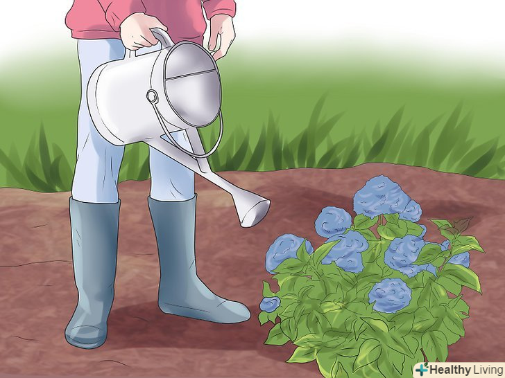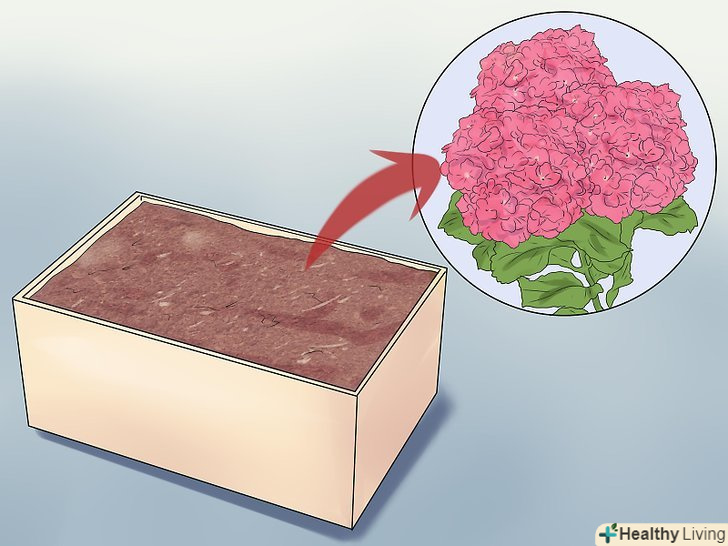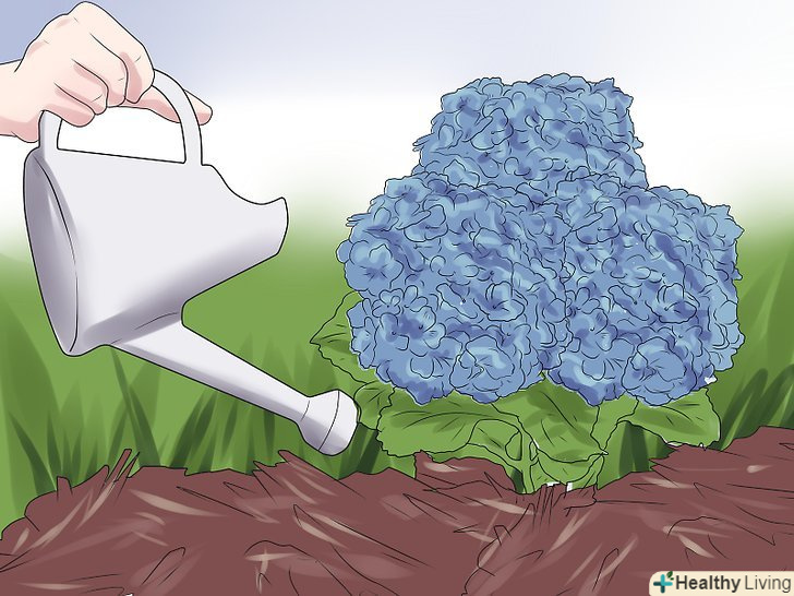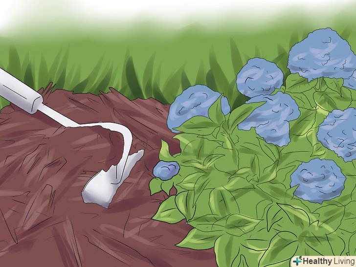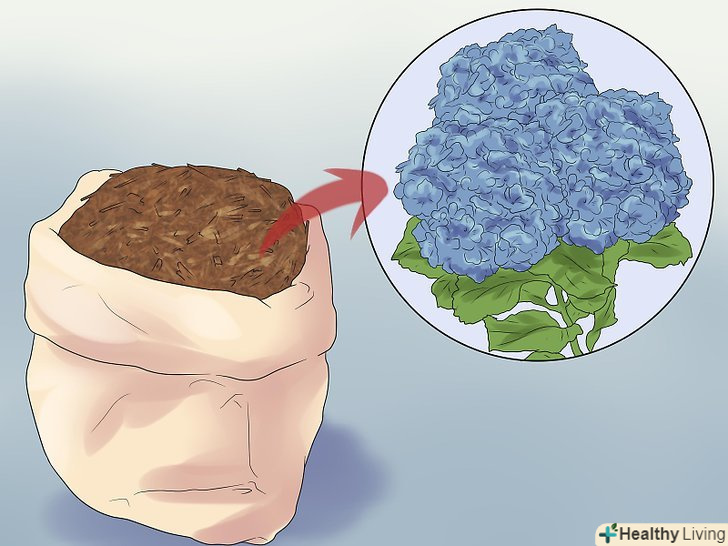 Для синіх гортензій використовуйте кислу мульчу. гортензії можуть цвісти рожевими або синіми квітам. Потрібний колір досягається зміною рівня кислотності грунту. Сині гортензії люблять кислий грунт, а рожеві потребують більш лужної. Кисла мульча змінить показник pH грунту і стимулює утворення квітів синього кольору.- Використана кавова гуща може служити хорошою кислотною мульчею. Її можна попросити в місцевому кафе. Вони зазвичай викидають кавову гущу, так що проблем з цим виникнути не повинно.