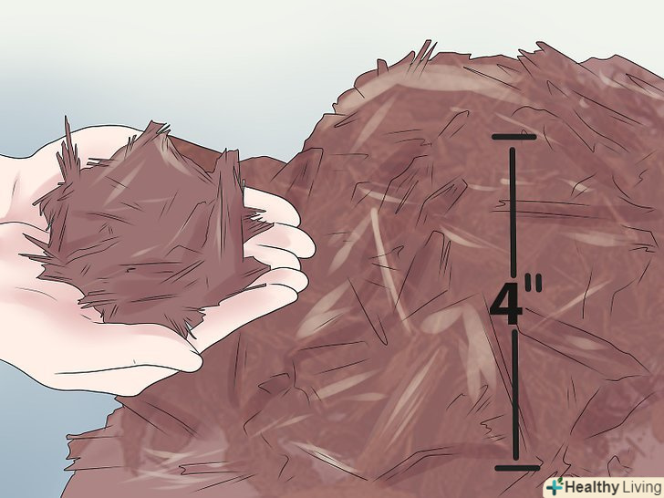 Внесіть шар мульчі товщиною приблизно 10 сантиметрів. для кращого результату вносите досить товстий шар мульчі, товщиною приблизно 10 сантиметрів.- Як правило, тонкотекстурні мульчі, такі як деревне борошно або тирса, вносяться більш тонким шаром (приблизно в 8 сантиметрів), ніж мульчі, що складаються з великих шматочків.
