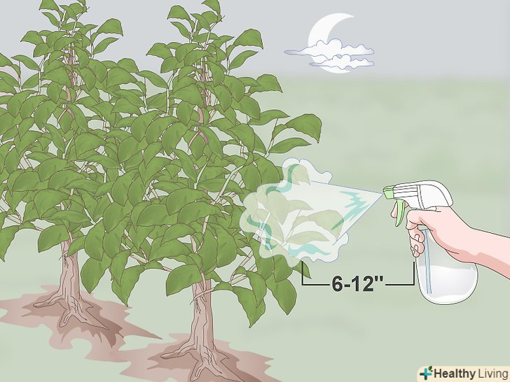 Обприскуйте листя вечорами. підносите пляшку зі спреєм до листя на 15-30 сантиметрів. Наносите спрей рівномірним шаром на верхню і нижню сторону листя. Багато комах вважають за краще ховатися на нижньому боці листя, там може вирости і борошниста роса. [15]- Найкраще застосовувати спрей у вечірній час, коли сонце не може обпалити листя, а комахи більш активні.