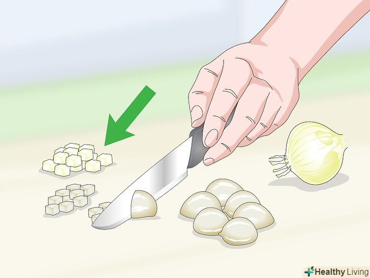 Подрібніть часник і цибулю. поріжте часник ножем або подавіть пресом. Покладіть цибулю на обробну дошку і поріжте його гострим ножем на дрібні кубики. Пересипте порізану цибулю і часник в каструлю. [7]