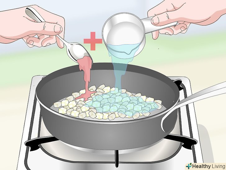 Додайте в каструлю воду і кайенский перець. замість меленого кайенского перцю можна використовувати пластівці червоного перцю або свіжий гострий перець (наприклад, халапеньо або хабанеро). Якщо ви вирішили використовувати свіжий перець, дрібно поріжте його, перш ніж класти в каструлю.- Щоб посилити властивості пестициду, додайте в каструлю також 3-4 свіжих або сухих листа м'яти. М'ята відлякує сонечок та інших жуків. [8]