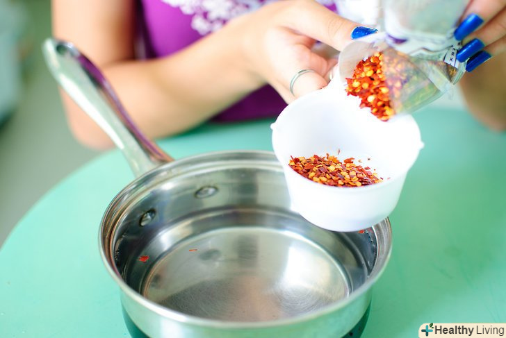Підігрійте розчин на сильному вогні і варіть 15 хвилин. поставте каструлю на плиту і накрийте кришкою. Зачекайте, поки вода не закипить, і зменшіть вогонь до середнього. Потім регулярно перемішуйте розчин, поки він готується, щоб перець розчинився у воді. [3]- Якщо з каструлі виходить багато пари, ваші очі можуть почати сльозитися. Намагайтеся тримати обличчя подалі від пари і під час помішування залиште каструлю частково закритою.