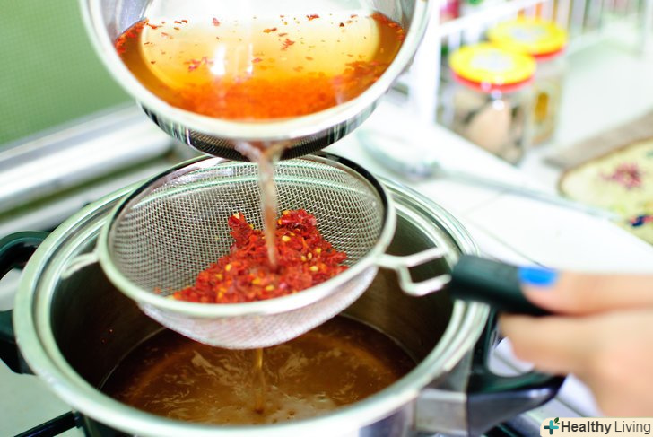 Процідіть воду і викиньте перець. процідіть рідину через сито і зберіть воду у великій каструлі під ним. Це дозволить відокремити перець від води і залишити тільки перцевий аерозоль. [5]- Оскільки ви збираєтеся розпилювати рідину, не залишайте гострий перець у воді. Він може засмітити пульверизатор, зробивши спрей менш ефективним.