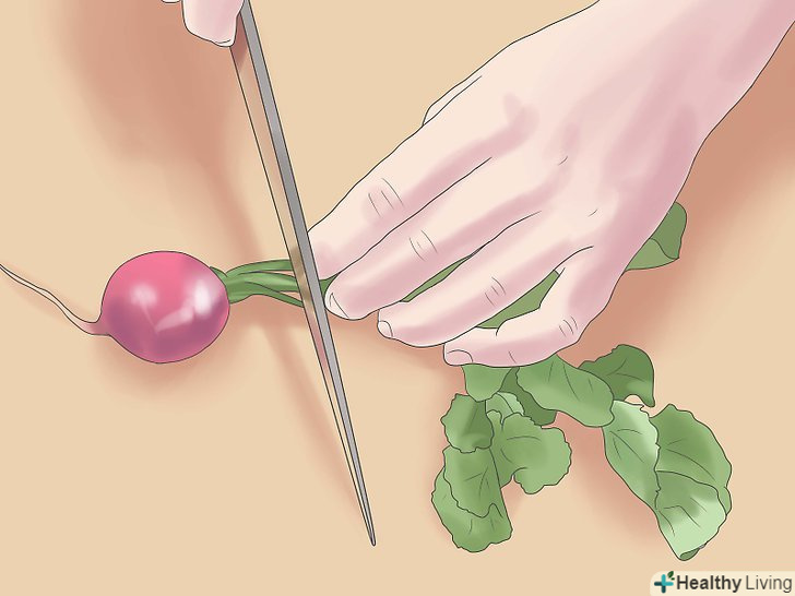 Витягніть редиску прямо з землі. висмикувати її досить легко. Для цього візьміть її за бадилля і потягніть вгору. Можливо, вам доведеться злегка посмикати редиску в різні боки, щоб вона легше висмикнулася з землі, але в більшості випадків збір редиски не вимагає великих зусиль. [4]- Важливо те, щоб ви зібрали редиску, як тільки вона дозріє. Вона збережеться довше у вашому холодильнику, ніж в землі.