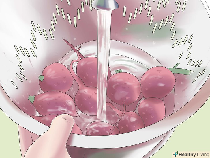 Редиску потрібно помити. зберігайте її в холодильнику. Після того, як ви відріжете бадилля, то помийте редиску під краном. Покладіть її в герметичний пластиковий пакт і зберігайте в холодильнику протягом двох тижнів.- Бруд з коренеплодів можна зчищати пальцями або щіткою.