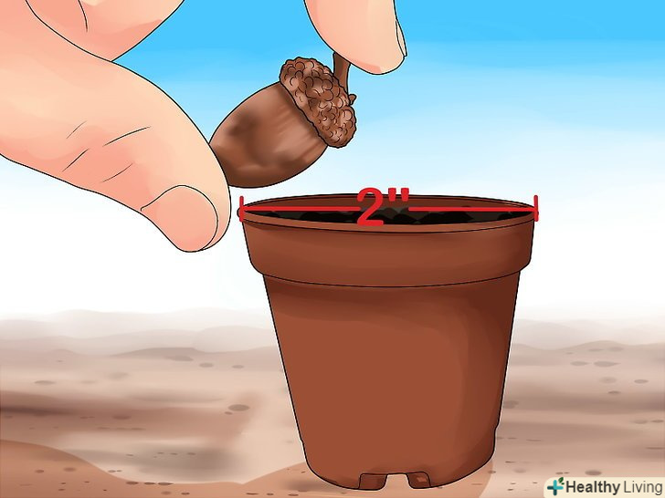 Посадіть кожен Жолудь в горщик або контейнер. знайдіть для ваших рослин невеликі в діаметрі (5 см) горщики для розсади (або великі пластикові склянки). Наповніть їх якісним садовим грунтом (деякі джерела радять додати подрібненого торф'яного моху [6] ). Не засинайте грунт доверху; залиште зверху приблизно 2 сантиметри для поливу. Посадіть ваш Жолудь неглибоко корінцем вниз.- Якщо ви використовуєте пластикові склянки, проткніть дірочки з боків внизу склянки, щоб зайва вода не застоювалася.