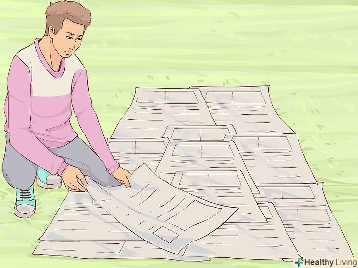 Накрийте ділянку газетами. щоб повністю вбити всю наявну на ділянці рослинність, накрийте її газетами. Газети знищать рослинність, закривши їх від сонця. Більшість чорнила в газетах не завдадуть грунті ніякої шкоди. Головне, не використовуйте глянцеві сторінки і сторінки на крейдованому папері, на якій розміщують рекламу. Поверх газет насипте товстий шар компосту. Залиште газети аж до весни. [5]- Чотирьох або п'яти аркушів газети буде достатньо.