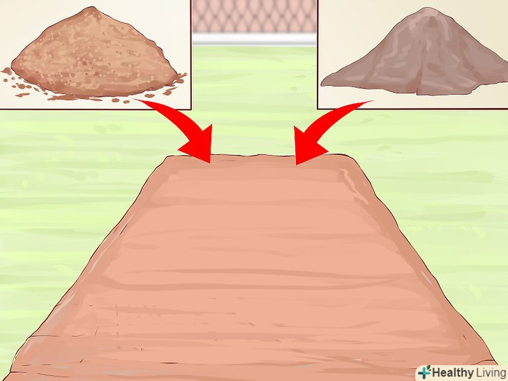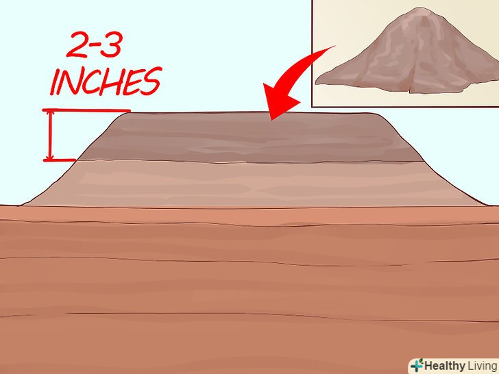 Висипте на ділянку перегній. коли земля буде перекопана, висипте на неї перегній або компост. Товщина шару не повинна перевищувати 5-7, 5 см.потім знову перекопайте землю, щоб змішати її з компостом. Не використовуйте занадто дрібний компост або компост із занадто піщаною консистенцією, оскільки він занадто швидко розвалиться. В ідеалі компост повинен складатися з великих грудок і невеликих частинок. [9]- Перегній або компост наситить грунт поживними речовинами і поліпшить її структуру.