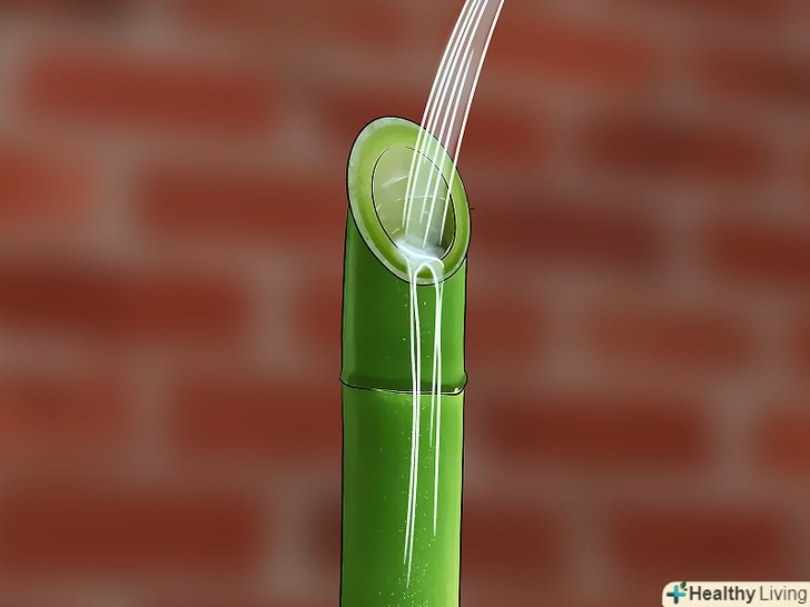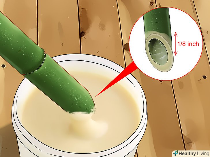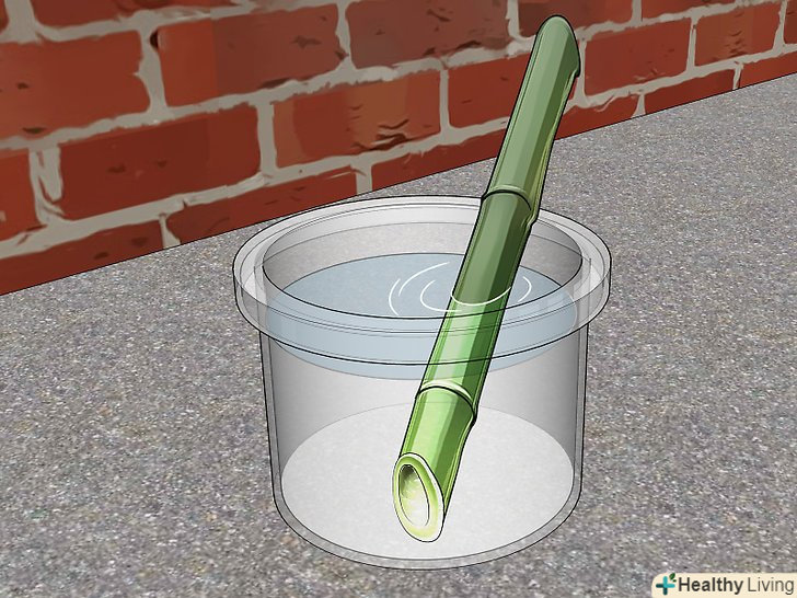 Виберіть відповідний інструмент для різання бамбука і простерилизуйте його. вибір інструменту залежить від того, наскільки товстий і міцний бамбук. Якщо бамбук має тонкі стебла, досить буде гострого ножа. Для більш товстого бамбука може знадобитися ножівка. Який би інструмент ви не вибрали, його слід попередньо стерилізувати побутовими дезінфікуючими засобами, наприклад розведеним хлорним відбілювачем або спиртом. [1]- Якщо ви використовуєте для стерилізації хлорний відбілювач, спочатку розведіть його водою. На кожну частину відбілювача додайте 32 частини води. Наприклад, на 1 столову ложку (15 мілілітрів) відбілювача слід використовувати 1/2 літра (500 мілілітрів) води.