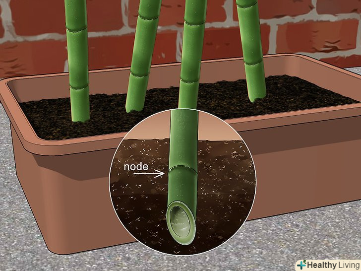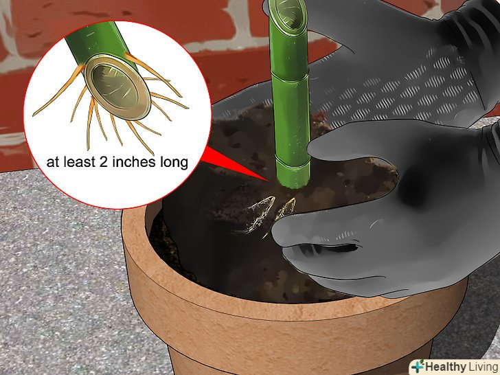 Покладіть кореневище в горщик горизонтально нирками вгору. засипте в горщик шар грунту для кімнатних рослин. Розташуйте кореневище так, щоб стебла бамбука росли вгору. Якщо на кореневищі є стебла, простежте, щоб їх кінці знаходилися над грунтом. [16]