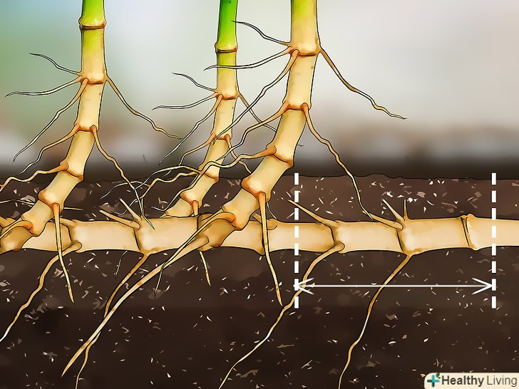 Виріжте садовим ножем частина кореневища з 2-3 ростовими нирками. обережно очистіть кореневу систему бамбука від землі. Знайдіть ділянку кореневища з 2-3 ростовими нирками, тобто такий, з якого ростуть стебла. Можливо, доведеться відрізати стебла від кореня. Виріжте відповідний відрізок кореневища гострим ножем. [15]- Не використовуйте темні або плямисті відрізки кореневища. Це ознаки хвороби або шкідників. Такі коріння будуть гірше рости.