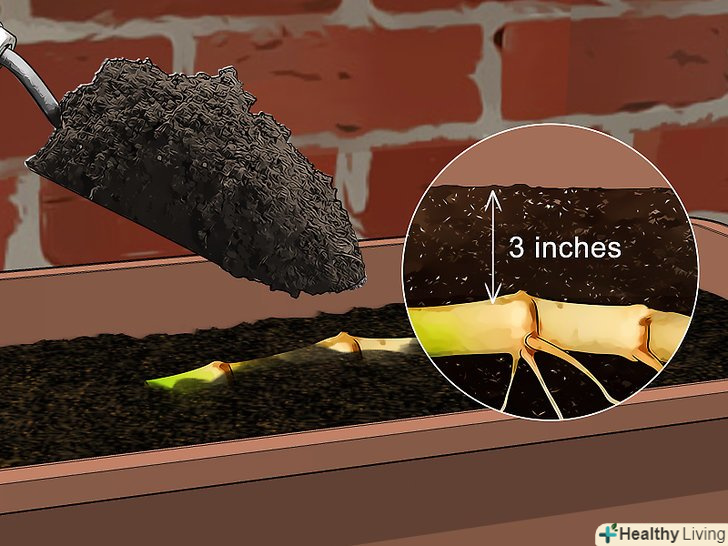 Присипте кореневище шаром грунту товщиною близько 8 сантиметрів. зарийте корінь, щоб він міг розвиватися і рости. Ущільніть грунт, щоб вона облягала кореневище з усіх боків. [17]