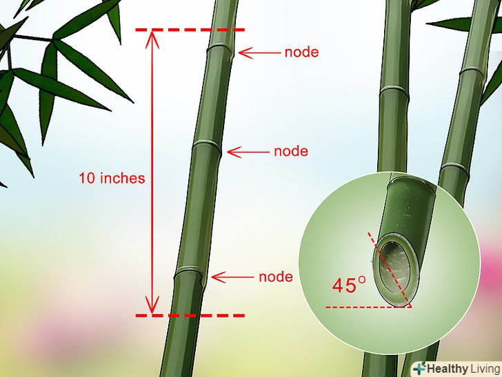 Відріжте шматочок стебла бамбука довжиною 25 сантиметрів під кутом 45°. кожен вирізаний держак повинен містити хоча б 3-4 вузла (оперізують стебло кільця). Щоб держак успішно пустив пагони, його діаметр повинен бути не менше 2,5 сантиметра. [2]