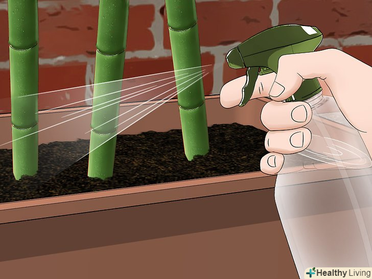 Тримайте горщики в теплому місці в стороні від прямого сонячного світла і щодня поливайте землю. поки живці бамбука вкорінюються, їх слід тримати в основному в тіні, хоча не завадить трохи світла протягом дня. Щодня перевіряйте землю і стежте, щоб вона залишалася вологою. При цьому вода не повинна затримуватися нагорі грунту. Надмірна кількість води підвищить ризик розвитку кореневої гнилі. [8]- Можна надіти на держак пластиковий пакет, щоб утримати вологу, хоча він може рости і без цього. [9]
