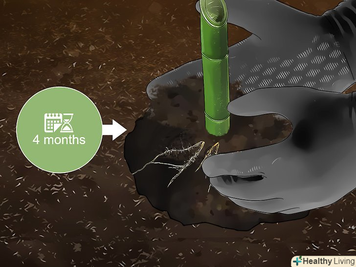Через 4 місяці пересадите бамбук. протягом 3-4 тижнів живці повинні підрости, і з їх вузлів з'являться нові гілки. Тримайте держак в горщику 4 місяці, потім пересадите його в землю. [10]- Обережно послабте землю в горщику за допомогою лопатки або шпателя, щоб її можна було легко дістати. Пересадите бамбук в ямку, обсяг котрої трохи більше його кореневої системи. Присипте коріння землею і рясно полийте рослина. [11]