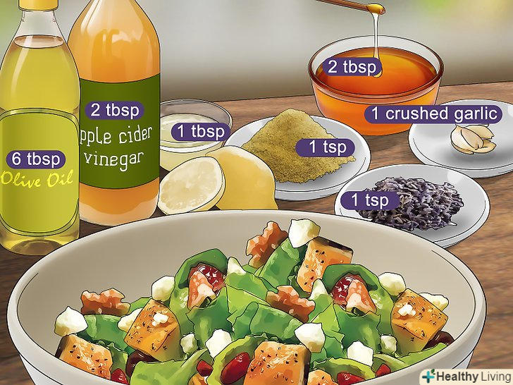 Додавайте лаванду в салати. Змішайте 6 столових ложок (90 мл) оливкової олії, 2 столові ложки (30 мл) бальзамічного або яблучного оцту, 1 столову ложку (15 мл) лимонного соку, роздавлений зубчик часнику, 2 столові ложки (30 мл) меду, 1 чайну ложку (2 грами) гірчичного порошку і 1 чайну ложку сушених квітів лаванди. Заправте салат і насолоджуйтеся прекрасним смаком! [15]