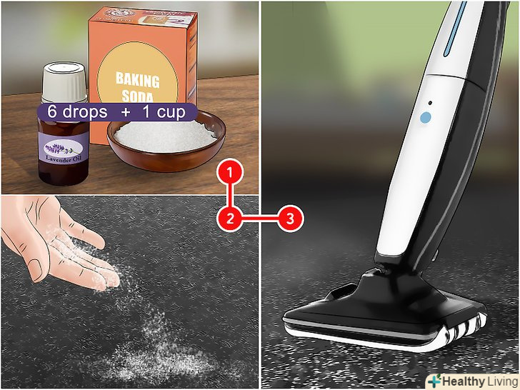 Почистіть килим. візьміть склянку (260 грамів) харчової соди і додайте 5-6 крапель лавандового масла. Посипте содою і почекайте 1 годину, потім пропилососьте. [16] це допоможе освіжити килим.