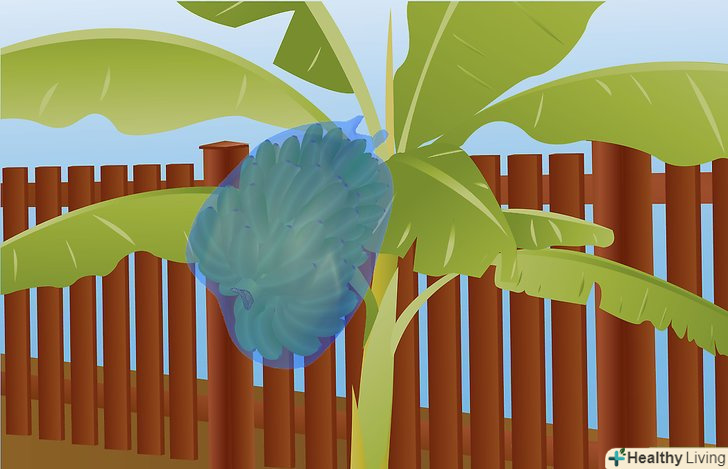 Накрийте плоди пакетом. нейлонові мішки для рису теж добре підійдуть. Пам'ятайте, що у поліетиленових пакетів / нейлонових мішків повинна бути внизу Дірка, щоб пропускати воду. Зав'яжіть мішок м'яким шпагатом кілька сантиметрів вище від початку грона. Покривати грона банана великим синім мішком, коли плодам близько 2 місяців – теж хороша практика. Це дозволяє плодам вирости і захищає від птахів, кажанів і білок, які дуже люблять фрукти. Мішок допоможе утримати тепло (мініатюрний вид теплиці), а також оксид етилену, виділений фруктом, що прискорює дозрівання.