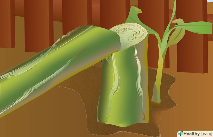 - Метод з використанням одного бамбука. Використовуйте триметровий бамбуковий жердину. Виріжте шматок дерева у формі рогатки 10 см завтовшки і 60 см завширшки. Вставте його в один кінець бамбукового жердини. Підставте під стебло середину " Y "і підніміть жердину, щоб стебло щільно прилягло до"Y". Інший кінець жердини занурте в землю. Натисніть дуже сильно.