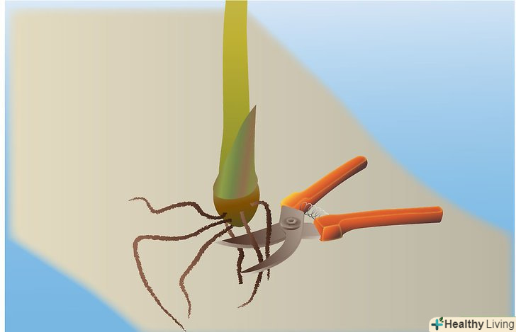 Видаліть всі старі і зламані коріння. Просто відріжте гострими ножицями старі і довгі корені, залишаючи кілька сантиметрів (можна і взагалі не залишати). Коріння скоро виростуть. Видалення коренів-важка робота, тому що коріння жорсткі, і іноді ви видаляєте верхній шар, а жорсткий ниткоподібний корінь залишається. Видаліть також зламані листя. Зазвичай достатньо залишити близько п'яти хороших листя, тому що велика кількість листя зменшує сонячне світло і робить грунт вологою.