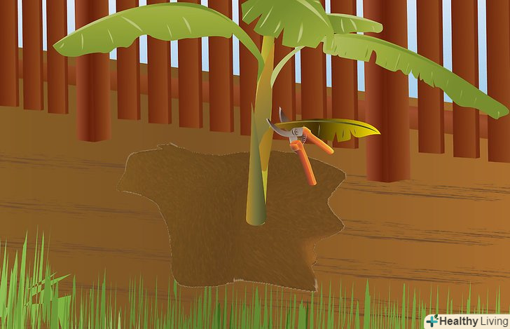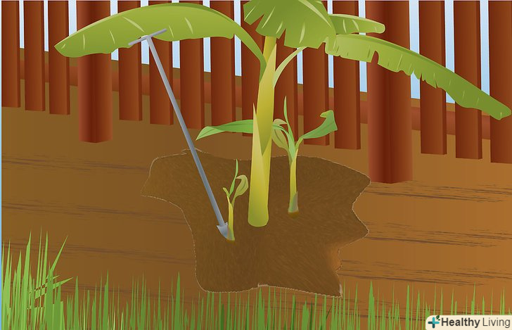 Приберіть зайві відростки. важливо контролювати популяцію рослин, щоб отримати великі грона і більш здорові рослини, а також обмежити вплив захворювань. Виберіть на наступний рік тільки один відросток, як правило, перший відросток, який з'явиться. Його називають "послідовником". Всі інші відростки слід відрізати на рівні землі і потім покрити місця зрізу землею. Якщо відростки виростають знову, просто повторіть процес, але на цей раз, замість того, щоб покрити землею місця зрізу, пробийте глибоко місця зростання, використовуючи залізний прут або дерев'яну палицю. Це слід зробити, якщо відростки досягли висоти 30 см.якщо обраний «послідовником» відросток має пагони, то їх потрібно прибрати. Завжди пам'ятайте про те, що необхідно вибрати третього «послідовника». Коли материнське рослини викидає бутон, перестаньте видаляти зайві відростки і залиште його рости.- Термін "послідовник" використовують для першого бананового відростка від материнської рослини, який буде рости, коли материнське рослини загине і буде наступним приносити урожай. Також термін" послідовник " може бути використаний для наступних відростків, які обрані для вільного росту і подальшого плодоношення. Подивіться на зображення вище: у рослини зліва ростуть плоди, а "послідовник" знаходиться праворуч, майже такої ж висоти, що і материнське рослини.