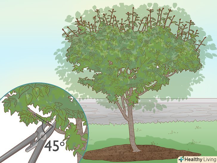 Підрізайте дерева влітку, щоб вони дали більше плодів. за допомогою гострих садових ножиць видаляйте всі відмерлі, хворі і сохнуть гілки. Зрізайте гілки під кутом 45 градусів в тому місці, де вони зустрічаються зі стовбуром. [17]- Як правило, краще не обрізати гілки молодше 3 років, якщо тільки вони не серйозно хворі або відмерли.