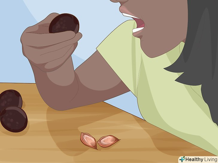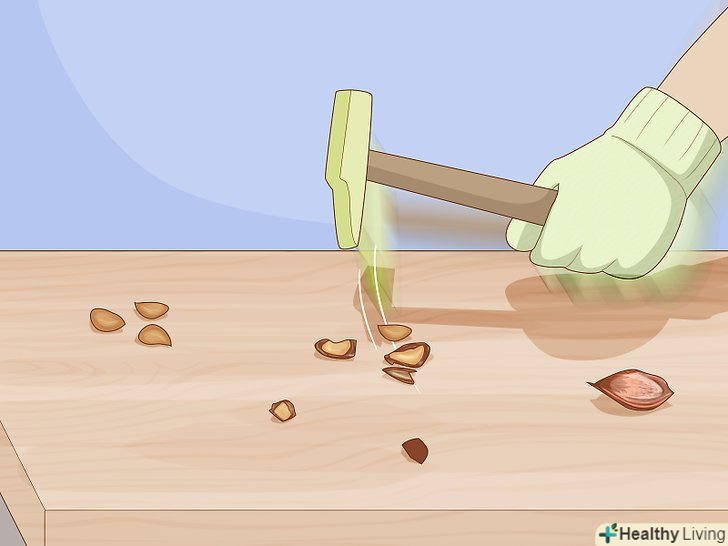 Розколіть кісточки невеликим молотком або щипцями для горіхів, щоб дістати насіння. після того як кісточки стануть сухими на дотик, акуратно постукайте по ним невеликим молотком або стисніть щипцями, щоб розколоти їх. Усередині кожної кісточки ви знайдете невелике мигдалеподібне насіння. Дістаньте його з кісточки і відкладіть в сторону. [4]- Розколіть всі кісточки і викиньте залишилася шкаралупу або покладіть її в компост .