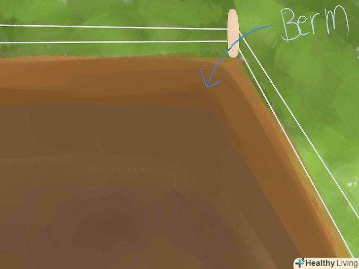 Побудуйте насип для утримання води всередині. Дощовий сад не буде функціональним, якщо вода буде просто виливатися з нього, тому якщо є хоч невеликий ухил, то слід зробити насип близько нижнього краю і підняти її як паркан. Якщо є залишки викопаної землі, можна її використовувати для цього, але для більш крутого схилу знадобиться принести ще більше землі. Для ефективності насип повинна бути досить високою, щоб оточити дощовий сад по периметру. Іншими словами, краї насипу по нижньому краю дощового саду повинні бути однакової висоти з вершиною схилу. У той же час насип не повинна бути "вище" вершини схилу, тому що це може викликати велике скупчення води в резервуарі.- На нижній край схилу потрібно буде досипати землі, щоб зробити насип вище. Якщо продовжити насип з боків, потреба в землі буде скорочуватися до тих пір, поки не дійдете до верхнього краю схилу, яка і без насипу задоволена висока.