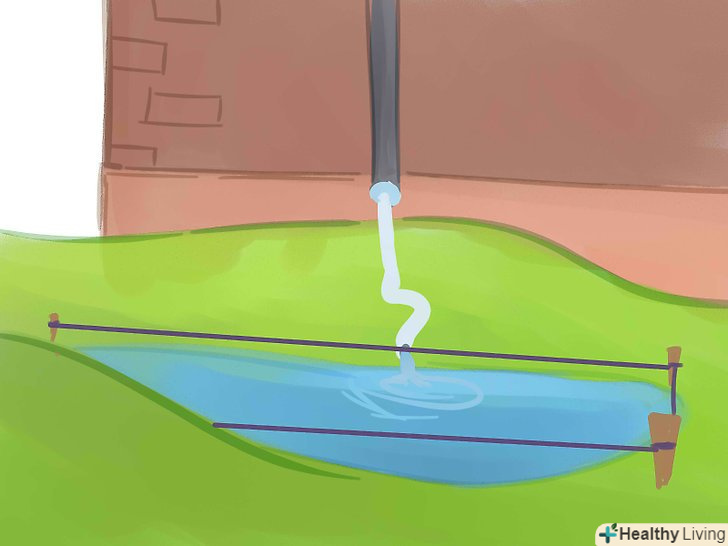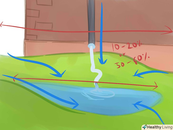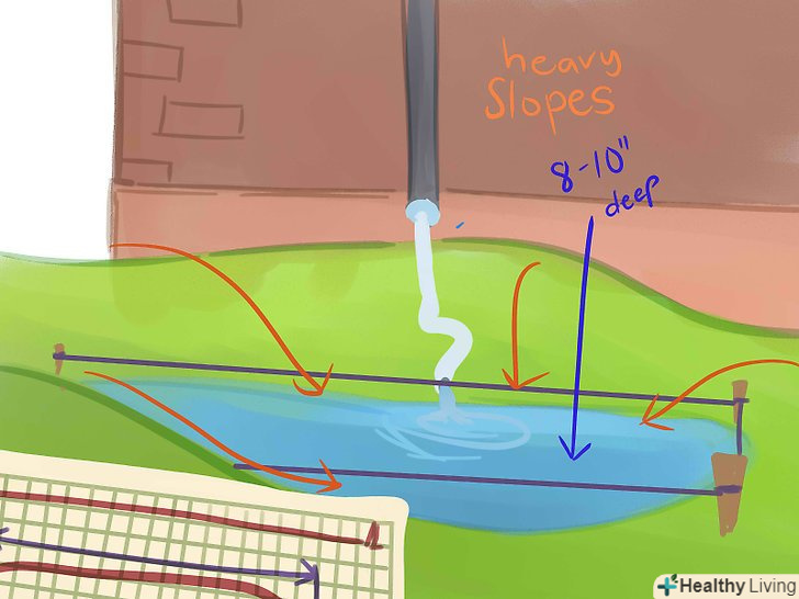 Медісон, штат Вісконсін. це фото було зроблено відразу після проливного дощу, але протягом 24 годин земля вбере воду. Обміркуйте правильне місце розташування для саду. Найлегше зробити дощовий сад в тому місці двору, де є стік або біля підніжжя схилу. Зазвичай це помітно при сильному дощі, коли потік води йде в одному напрямку і збирається в певному місці.- Дощові сади зазвичай розташовують мінімум в 3 метрах від споруди з метою зберегти фундамент від патьоків і руйнувань. Такі сади ніколи не розташовуються поверх систем очищення стоків, а також підземних комунальних ліній, трас – потрібно обов'язково уточнити це, перш ніж копати. Також для дощових садів не підходять місцевості, де сезонний рівень грунтових вод нижче 60 см від поверхні Землі, тому що інакше грунтові води завадять проникненню стічних вод в землю. Нарешті, великі дощові сади або ті, які потрібно глибоко прокопати, не повинні розташовуватися під великими деревами, тому що. розкопка може пошкодити їх коріння, і надмірне зрошення несприятливо позначиться на розвитку деяких видів рослин.