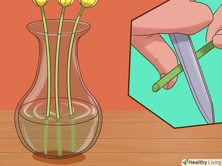 Підрізайте кожні кілька днів. кожен раз, змінюючи воду, підрізайте стебла приблизно на півсантиметра чистим гострим ножем.- Регулярне підрізання кінчиків дозволить видалити почала псуватися частина стебла, і розблокувати капіляри, розташовані вище. В результаті стебло буде легше поглинати воду, і тюльпани проживуть довше.