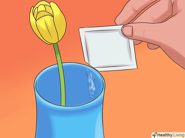 Можете додати підгодівлю. не існує єдиної думки про те, наскільки дієва підгодівля для зрізаних тюльпанів. Деякі вважають, що тюльпани в ній не потребують, проте немає і доказів того, що вона може нашкодити квітам, а значить, ви можете при бажанні додати її в якості попереджувального заходу.- Підгодівлю для квітів можна придбати в квітковому магазині. Можете купити її відразу разом з тюльпанами.