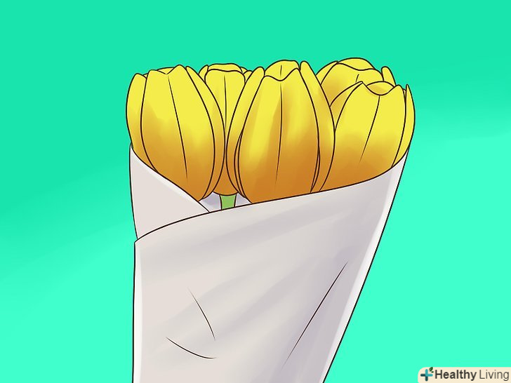 Поверніть букет. якщо ви поставили тюльпани вертикально, обома руками обхопіть букет відразу над краєм ємності і злегка поверніть верхівки стебел в одну сторону. [7]- В результаті букет злегка розкриється віялом, але стебла не зігнуться. Ефект буде не настільки помітний, як при перехрещуванні стебел, однак і навантаження на стебла виявиться нижче.