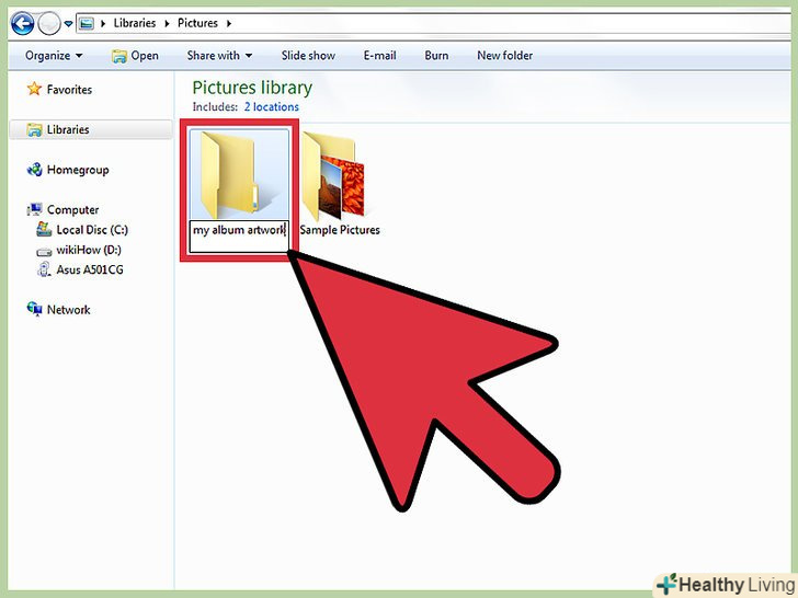 Перш ніж додавати обкладинки, відкрийте «Мій комп'ютер», потім папку «зображення», потім натисніть праву кнопку миші і виберіть «Нова папка». Можете назвати її «мої обкладинки альбомів».