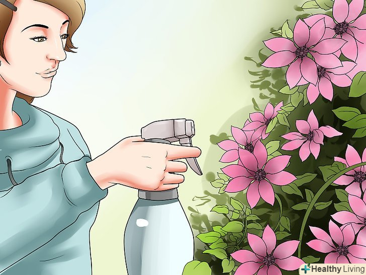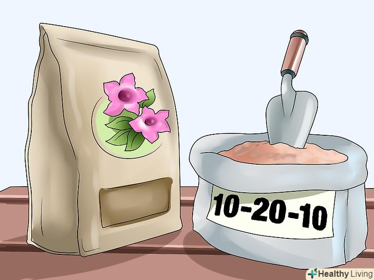 Навесні удобрюйте рослину якісним компостом або гранульованим добривом (наприклад, 10-20-10). кількість добрива буде залежати від його типу. Добриво для троянд, нанесене з проміжком в 1 або 2 місяці, забезпечить клематис достатньою кількістю поживних речовин. Можна також підливати добриво, багате калієм, 2-3 рази на місяць. Надлишок добрив може привести до утворення шкідливих солей в грунті, тому весь час стежте за здоров'ям рослини.- Позначення "10-20-10" описує співвідношення азоту, фосфору і калію. Азот відповідає за утворення листя, фосфор зміцнює коріння, а калій дозволяє рослині цвісти. У добривах азот і калій повинні бути приблизно в рівних кількостях, а фосфору повинно бути трохи більше.