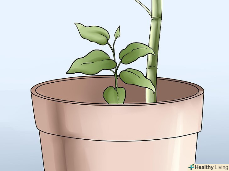 Встановіть опори для клематиса. як тільки рослина почне дертися вгору, встановіть бамбукову або будь-яку іншу решітку під невеликим кутом до горщика і якомога ближче до краю, намагаючись не зачепити коріння. У міру того, як стебло буде рости, обертайте його навколо опор за допомогою мотузки або ниток. Правильне вертикальне положення дозволить клематису рости вгору і в сторони, а це означає, що листя і квіток буде більше.