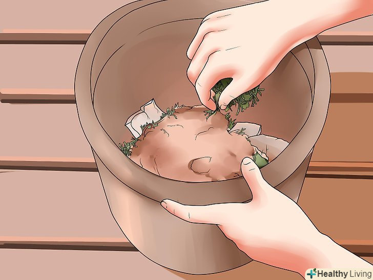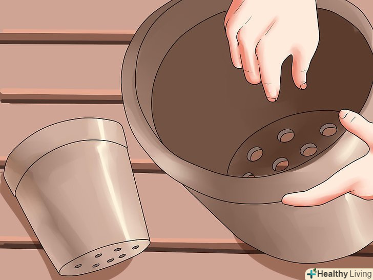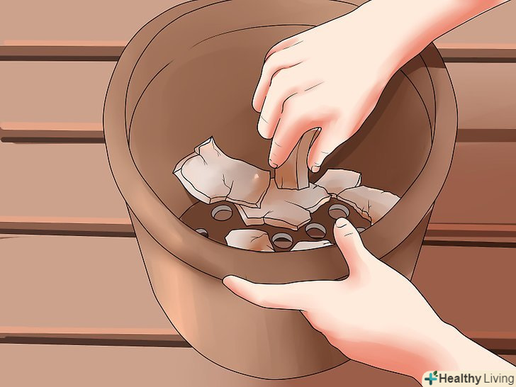 На дно горщика покладіть осколки керамічного посуду. можна також використовувати камені і гравій. Цей матеріал не дасть дренажним отворів на дні забитися грунтом, тобто буде сприяти правильному відтоку води.- Як правило, все це можна купити в садовому магазині, але якщо це вам не вдасться, можна зібрати камені на вулиці або розбити Старий керамічний горщик. Якщо ви вирішите збирати камені на вулиці, вам буде потрібно простерилізувати їх: покладіть їх в теплу мильну воду або в розчин, що складається з однієї частини відбілювача і чотирьох частин води.
