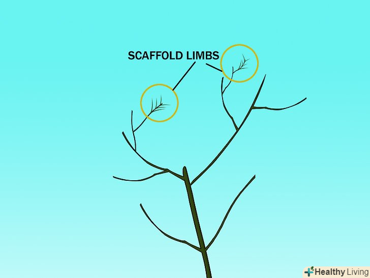 Влітку виберіть скелетні гілки. скелетні гілки-це найбільші гілки на дереві, які ростуть безпосередньо зі стовбура. Для початку, виберіть 2-3 такі гілки, але з часом це число може вирости і до 4-6 гілок.- Скелетні гілки повинні рости радіально, все в різних напрямках.