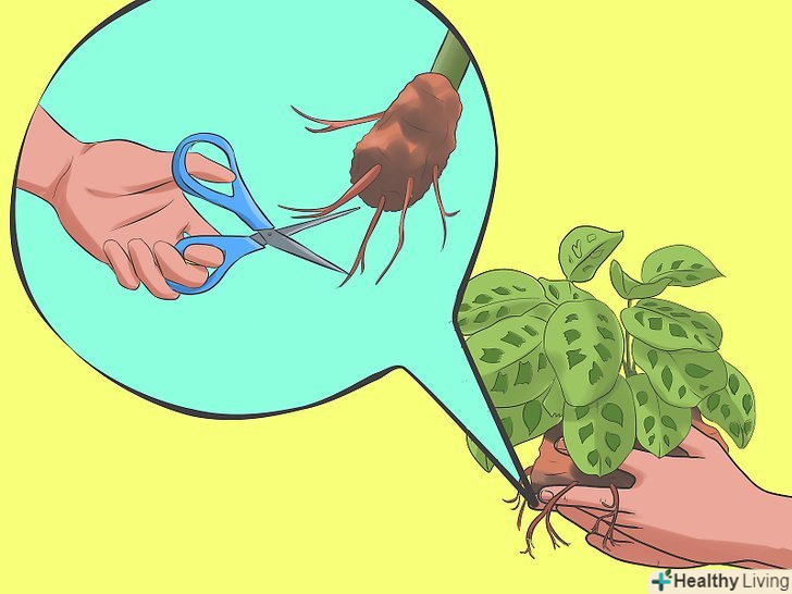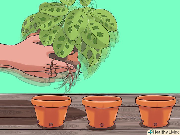 Вийміть рослину з горщика і розділіть його на частини. можна розділити маранту на кілька невеликих рослин, при цьому акуратно струсивши з коренів грунт. У кожного нового рослини повинна бути достатня маса корової системи і кілька стебел.- Висадіть нові саджанці рослини окремо в невеликі неглибокі горщики.